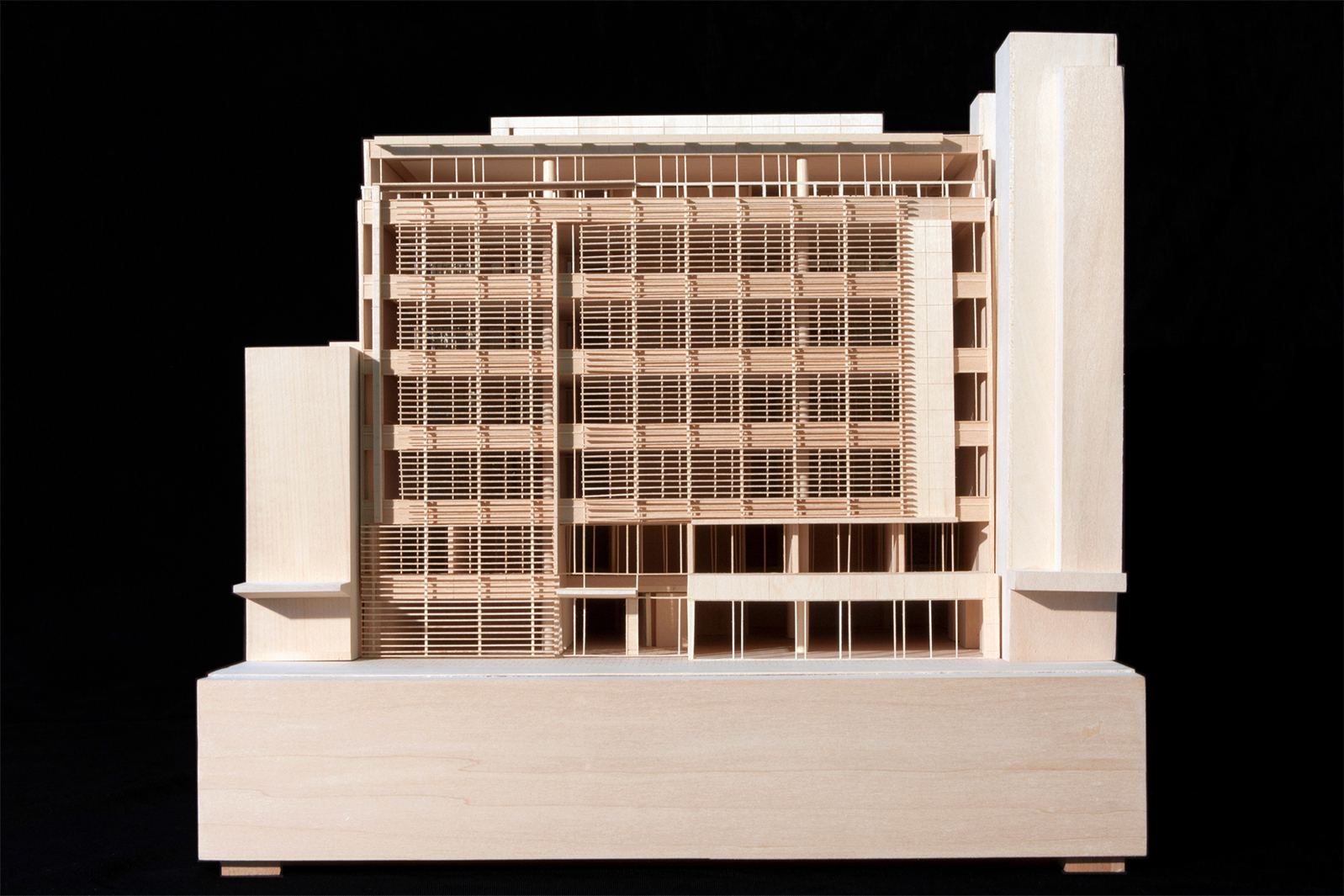 The eight-story building and its office space is organized around a central skylit atrium. On the south façade, a grand canopy marks the formal entrance to the building, while the southwest and northeast corners of the building are eroded to create intimate public arcades. These cuts, mirrored along a diagonal from northwest to southeast, are echoed by the parti of the curtain wall to suffuse the entire composition with a subtle dynamism. In addition to its highly efficient building envelope, key sustainable features include natural ventilation of the atrium during the summer, state-of-the-art mechanical systems, reduction of water runoff and storm water collection, a green roof, indoor air quality control, and the use of local and recycled materials.
