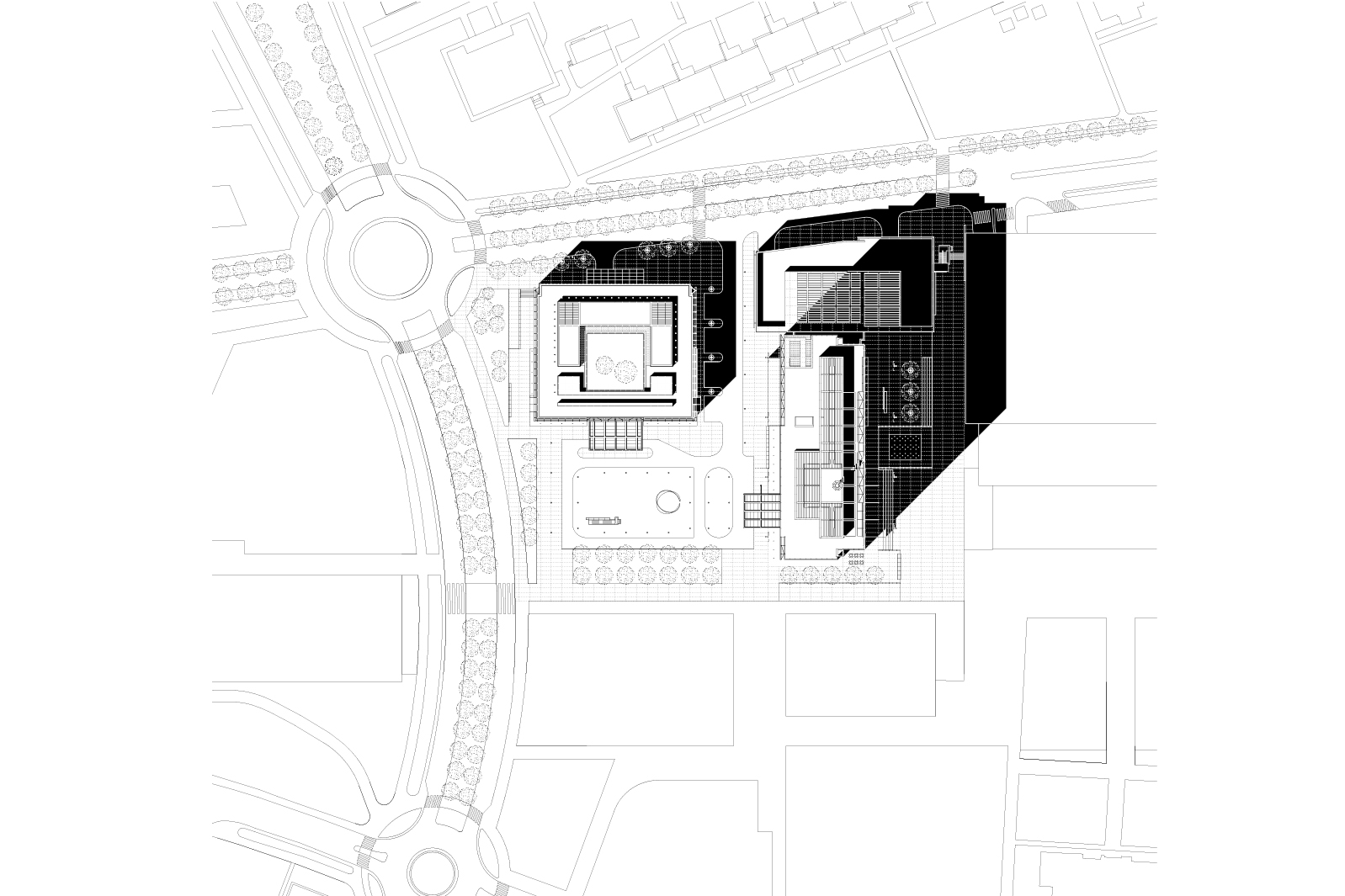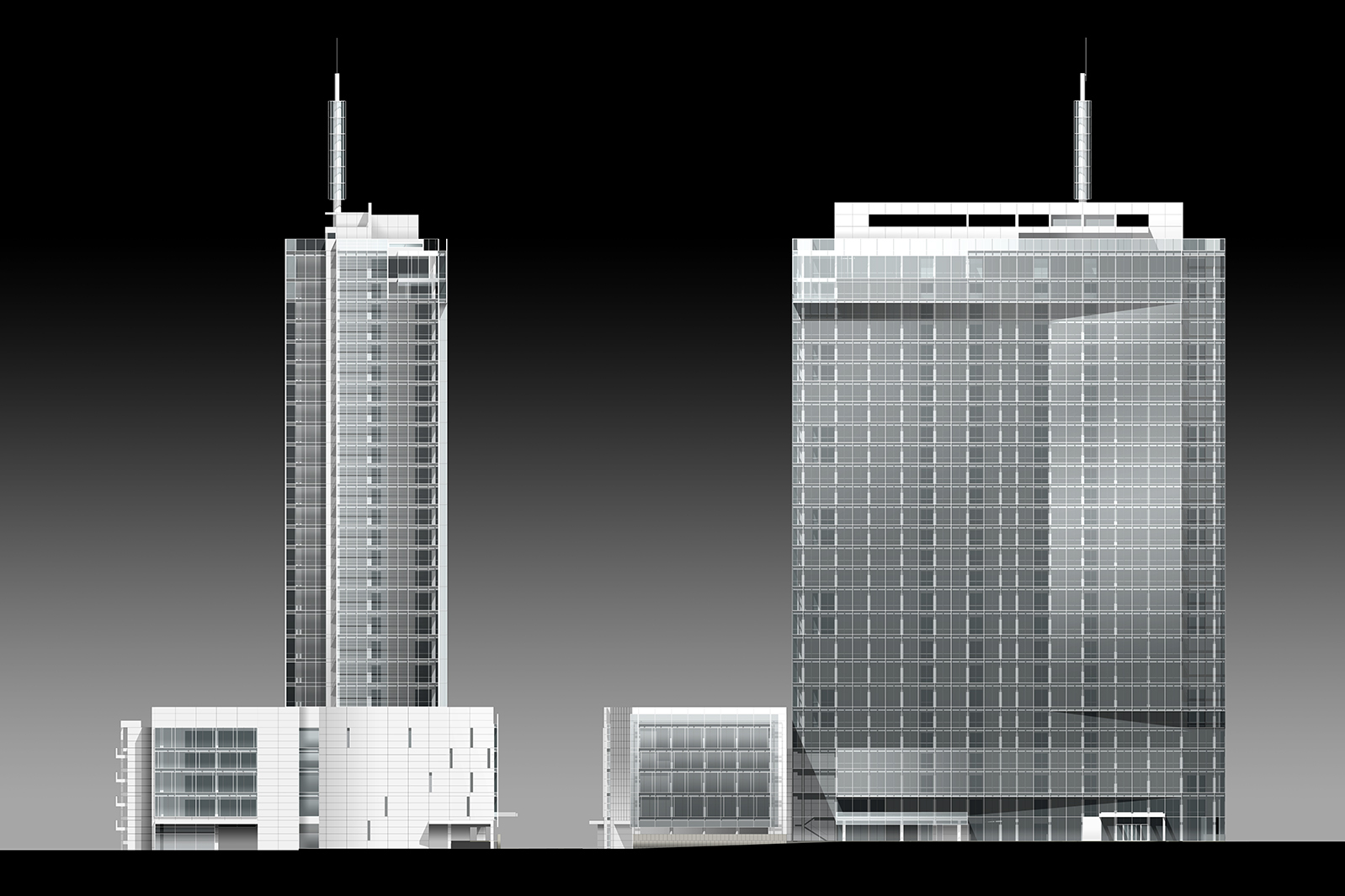 The building makes a dramatic statement to pedestrians at street level, combining sculptural entrance canopies and a striking dining terrace with a metal skin cladding the interior two-story lobby. Rising above this base, two interlocking volumes, defined by vertical metal panel walls at the north and south facades, express the building’s signature slender profiles and regulate the proportions of the composition. The orthogonal east facade is highly expressive with white frame profiles and metal fins in contrast with the smooth and undulating skin of the west facade. The building’s summit which contains a sculpted VIP restaurant and a platform with technical roof concealed by a double layer façade augments the silhouette of this unmistakable landmark.