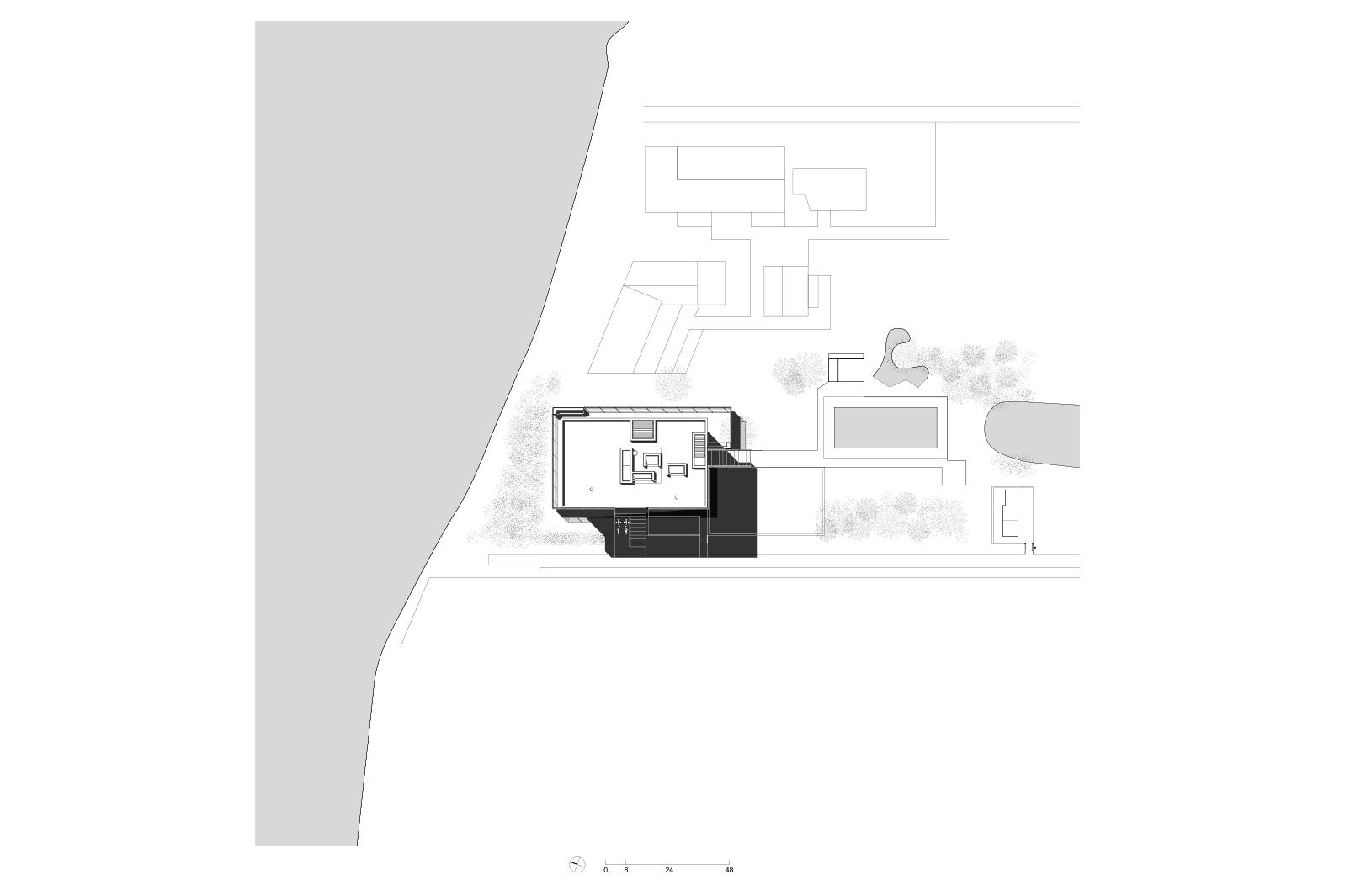 The main house extends across the site connecting to a garden, a swimming pool and accessory pool pavilions. These auxiliary elements are carefully composed to maximize the feeling of openness within the site, while the project’s material palette is minimal and understated, with an emphasis on lightness and transparency—glass, wood, and white finishes reflect the natural colors and beauty of the surrounding bay.
