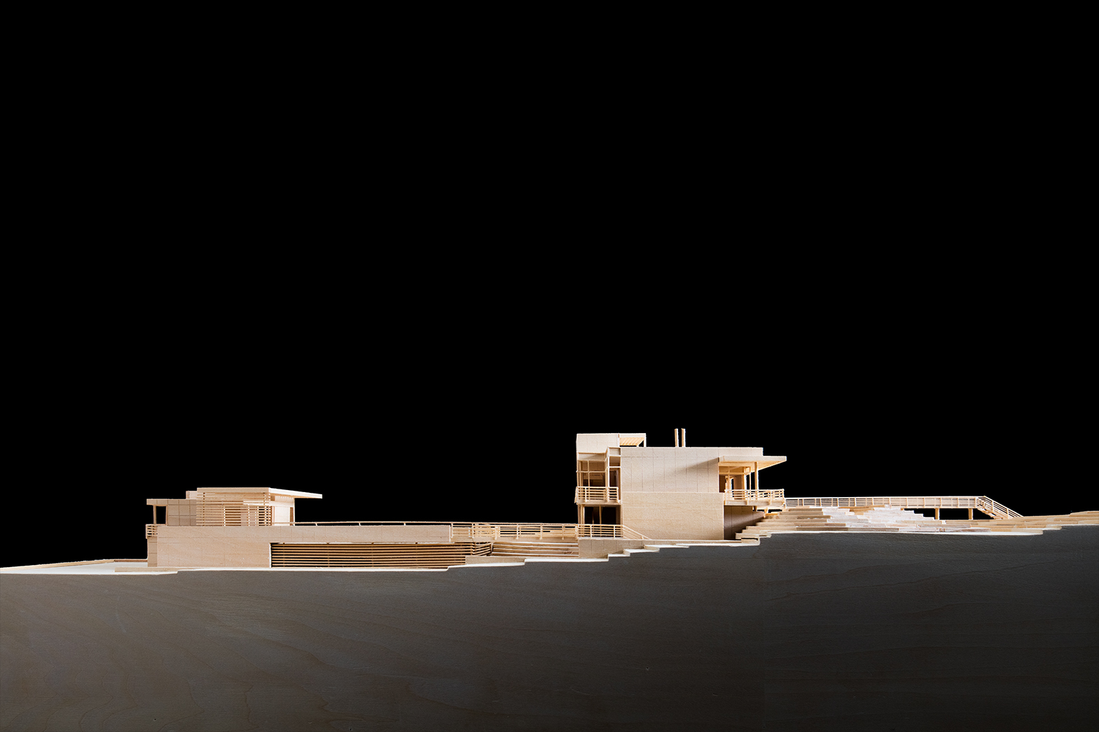 The progression through the site begins with a set of steps that lead up to the pool house. Ascending these stairs reveals dramatic views of the bay; continuing south along the main circulation walkway leads to a bridge connecting to the main house at the entry level and opening onto a glass vestibule. The second floor is accessed through a vertically contained grand stair that is animated with natural light by a continuous vertical louvered slot and skylight above. This level contains the main domestic spaces, including two bedrooms, a kitchen, a dining area, and a double-height living room, while the upper level houses another bedroom and the master bedroom, along with its bathroom and wardrobe. All areas of the house open up to exterior decks with a system of folding and sliding doors that bring light and breeze from the ocean, blurring the divisions between the architecture and the nature around the site.