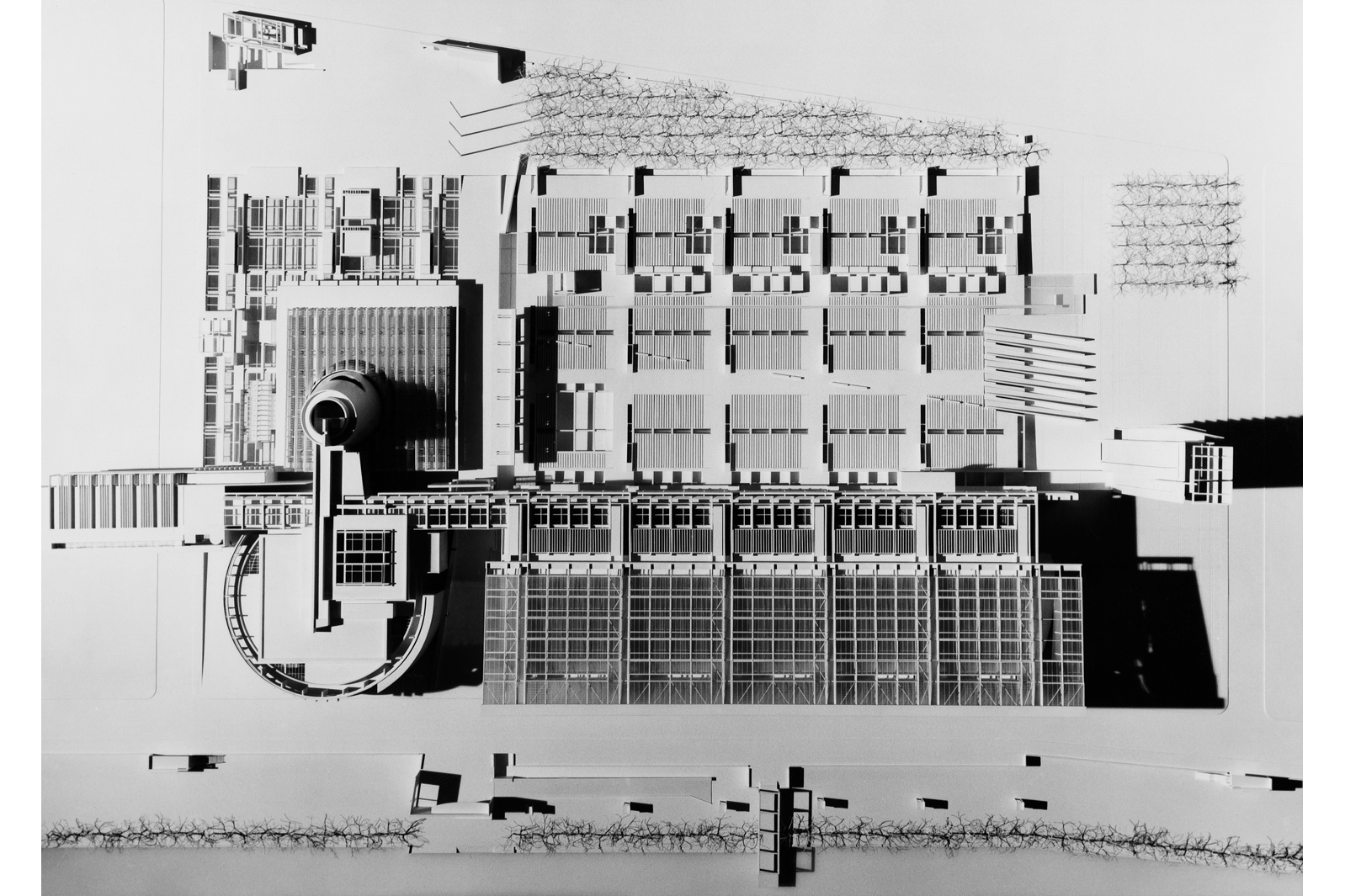 Following the competition guidelines, the design breaks the library’s overall massing into seven parts: the conical hybrid entrance and exhibition space, a colloquium space and restaurant, a film and music library, a recent acquisitions library, a main reading room, a research library, and an administrative wing. Using the golden section to organize this vast complex into a highly unified composition, Meier Partners emphasized natural light and open, continuous space throughout the design. The administrative areas were conceived as a vertical office tower at one end of the campus, establishing the library as an iconic presence on the city skyline, while the entire book storage and processing facility would be housed in a low-rise podium adjacent to an open public plaza, allowing the public to enter the complex by traveling over and through the collection itself.