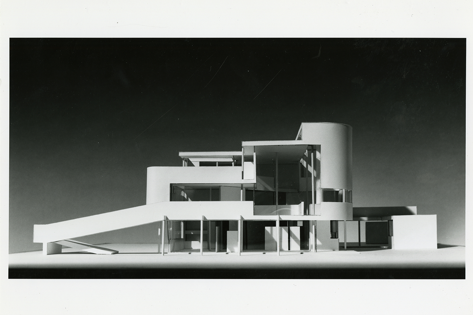 As in Meier’s iconic Smith House, completed at approximately the same time, the organization of the plan of the Saltzman House is based on a programmatic separation of public and private areas. Here, however, the two zones interpenetrate to a greater degree. The public space opens up like a funnel as the structure rises, so that the integrity of the closed private zone, located along two adjacent sides of the house, is partially eroded on the second level, then disappears entirely on the third, while this same upward trajectory reveals increasingly dramatic views of the Atlantic Ocean.